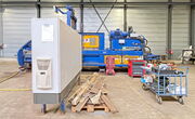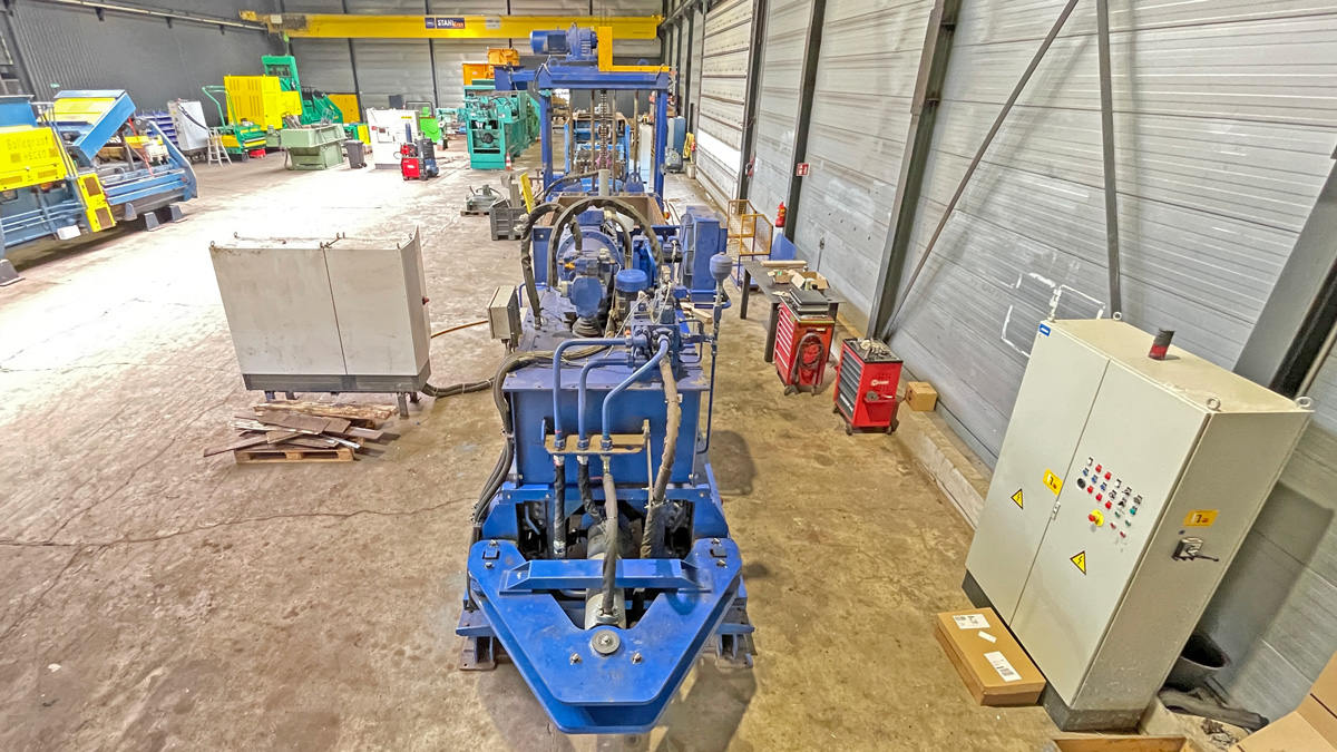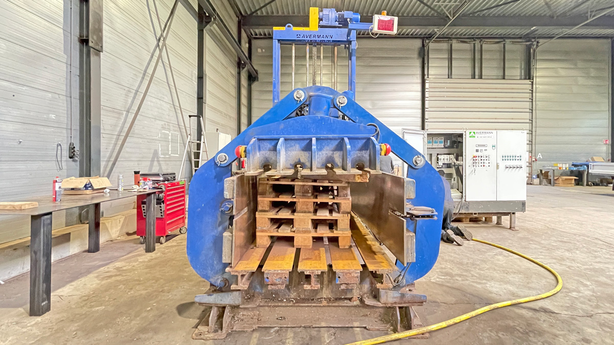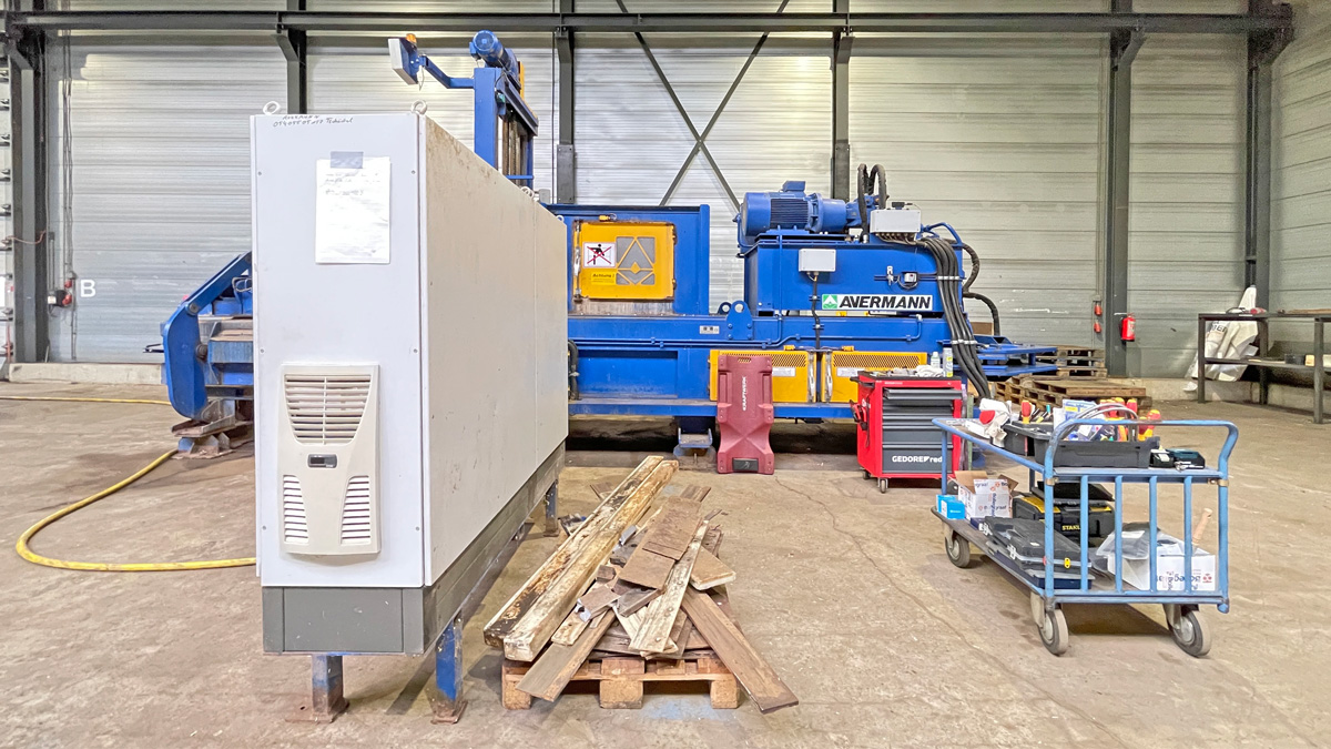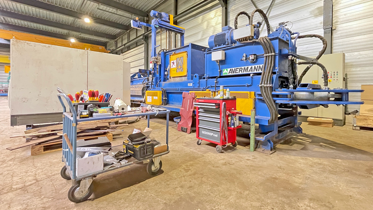 Avermann baling press, type AVOS 1410-45/85, 80 t pressing force, built in 2009, only 22,029 operating hours, with special press ram, partially overhauled, serviced, and tested