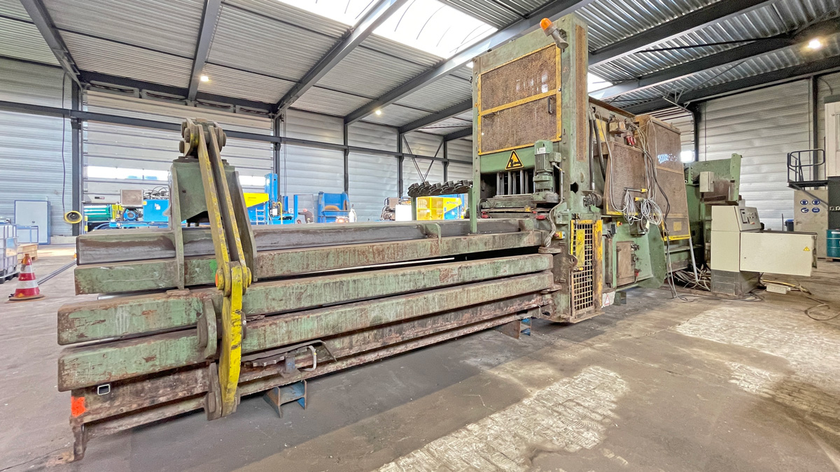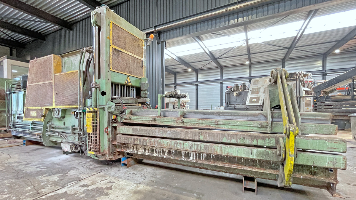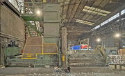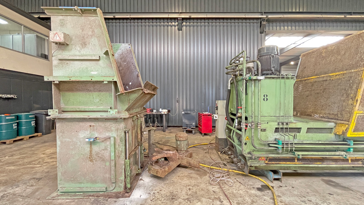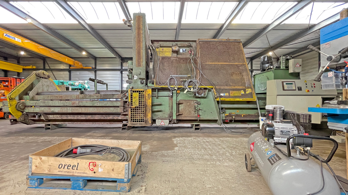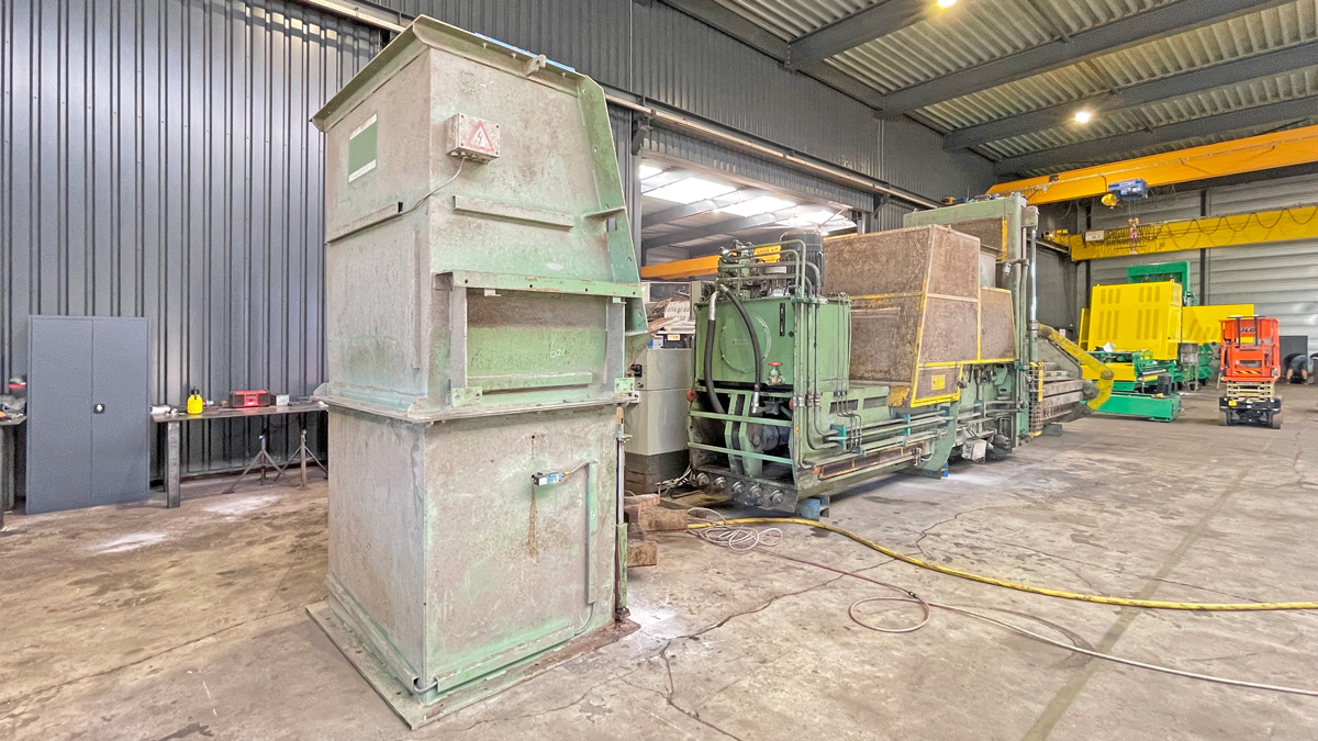 Baler Bollegraaf, type HBC 60 A, 60 t pressing force, yoc 2000, operating hours 32,169 h, drive power 45 kW, with chain belt conveyt and wire stations