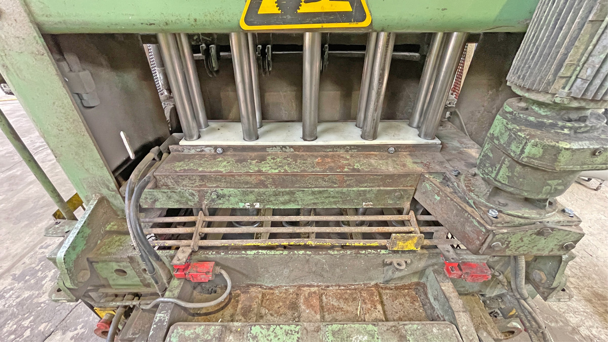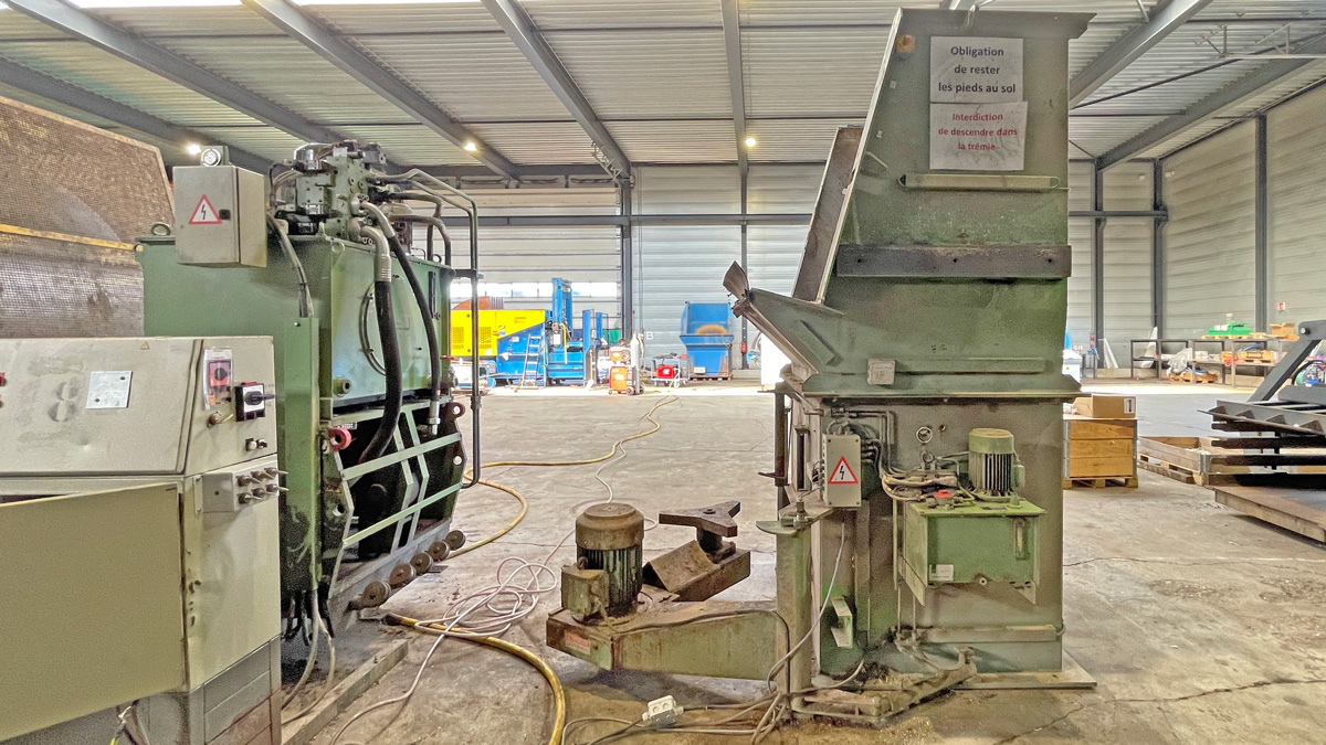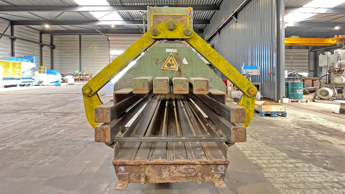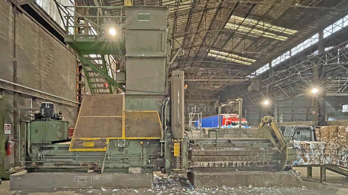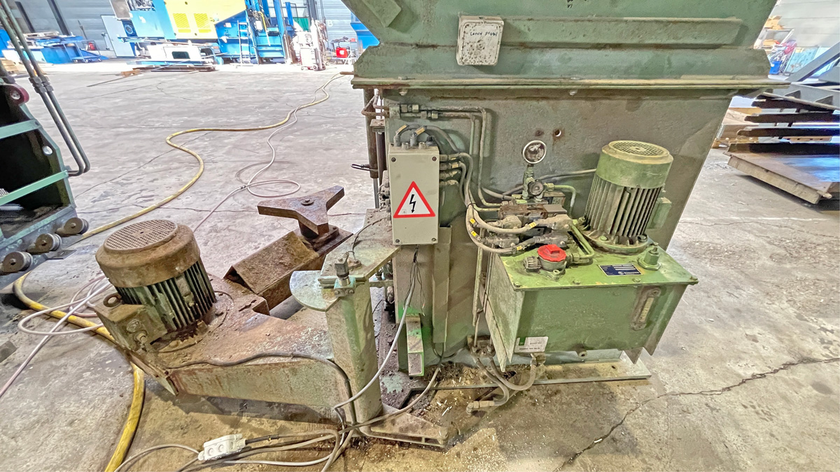 Baler Bollegraaf, type HBC 60 A, 60 t pressing force, yoc 2000, operating hours 32,169 h, drive power 45 kW, with chain belt conveyt and wire stations