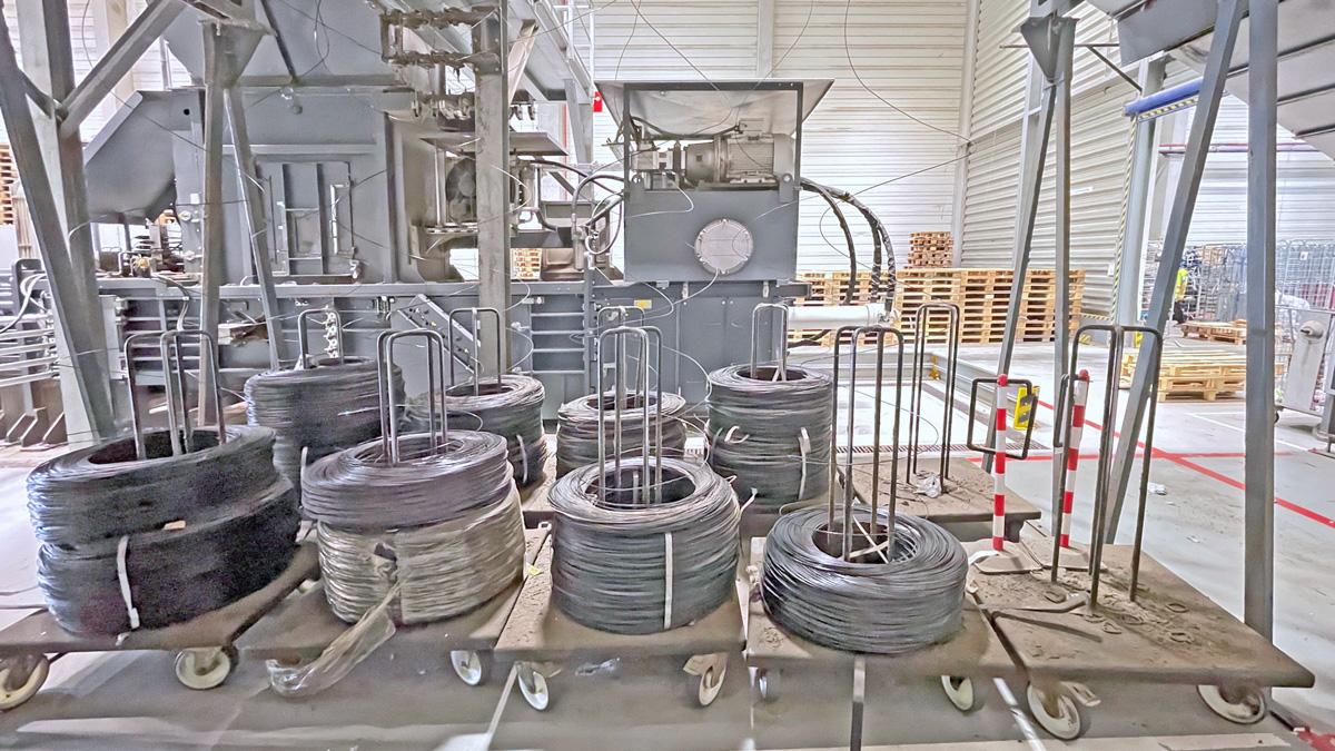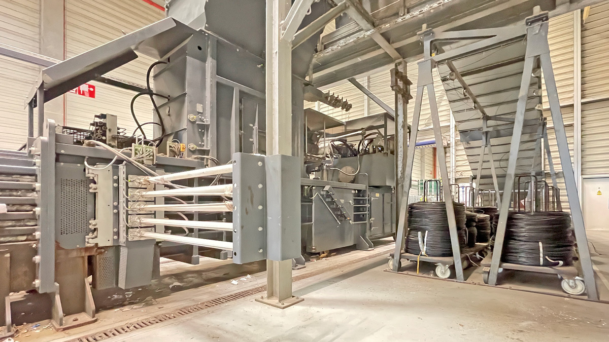 The conveyor belt, the transverse distribution belt and the baling press are for sale, with bale chute but without wire pulling stations and without wire. |